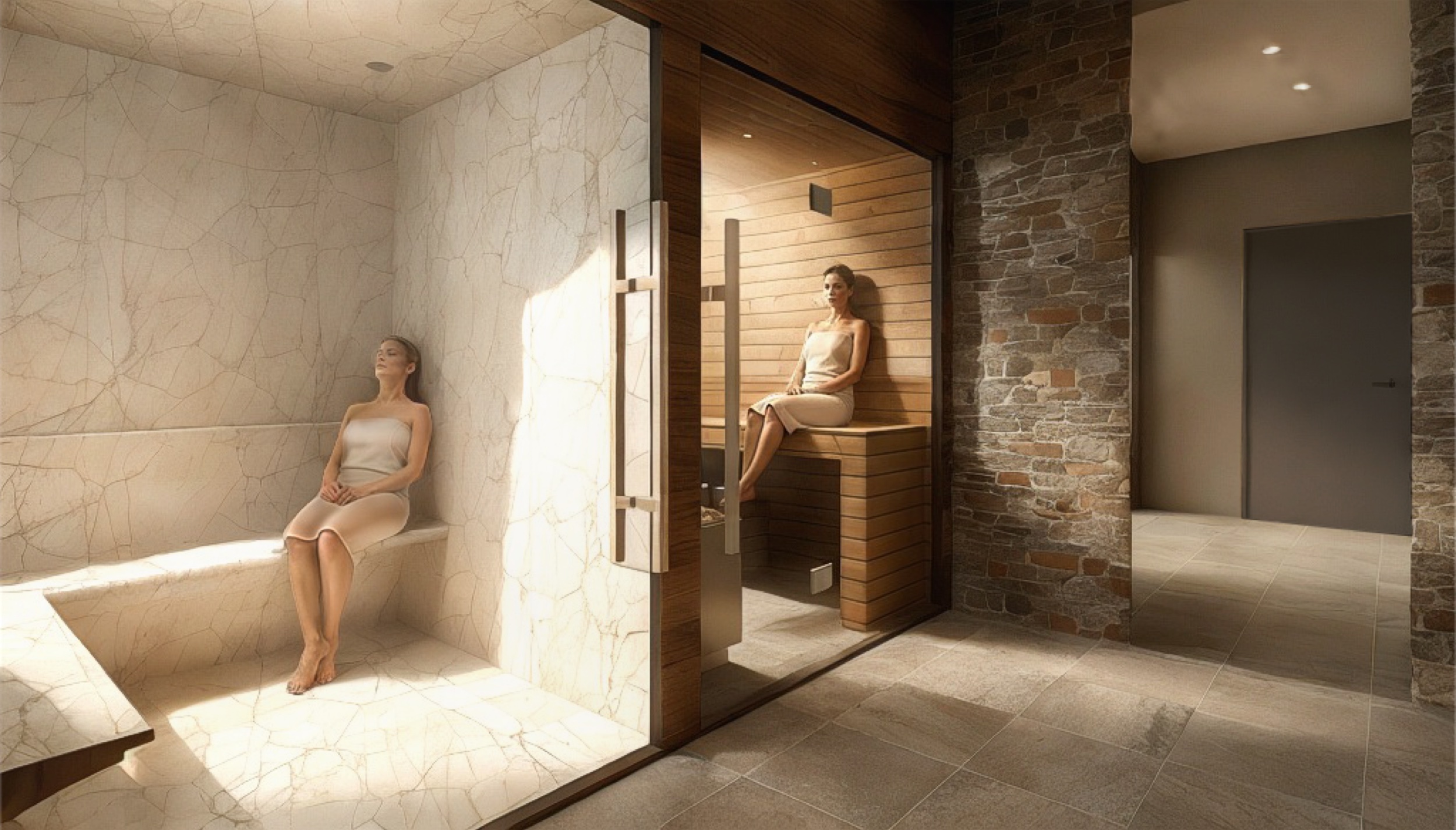 - ✦ Salles de douche en pierre, bois et Corian